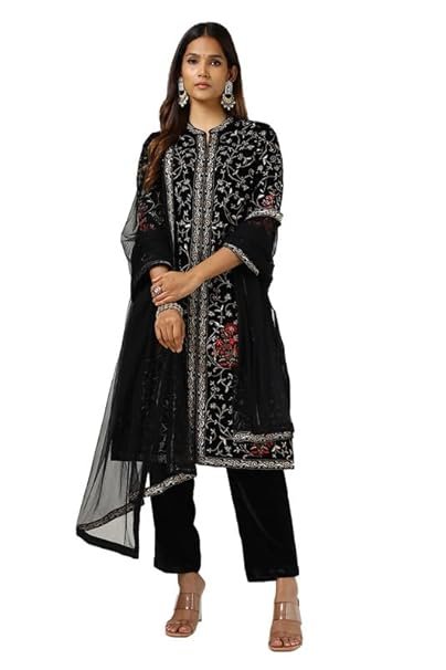 Womens Black Velvet Embroidered Suit Set With Thread Work