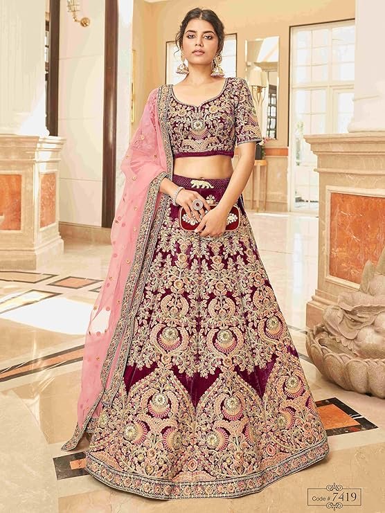 • Lehenga Fabric: Velvet; Blouse Fabric: Velvet; Dupatta Fabric: Soft Net; Inner: Santoon with Cancan(tulle) layered net