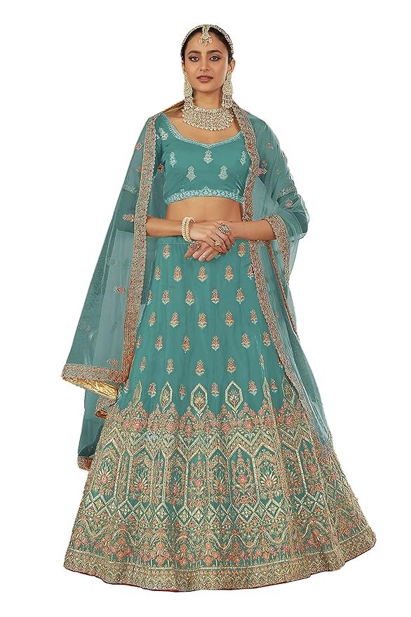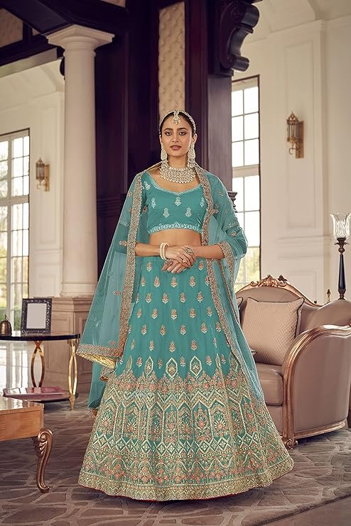 - Turquoise color organza base Stone and zari work lehenga.